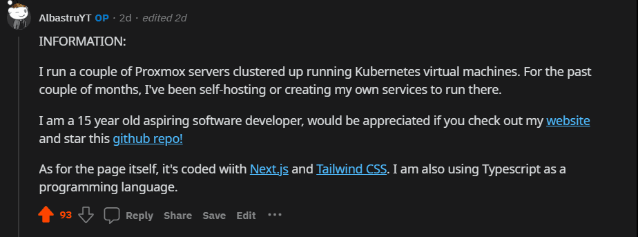 On my way to school I mainly browse Reddit on my phone, and that time I was browsing through r/selfhosted and discovered an interesting section called "Personal Dashboard", and what I saw amazed me: